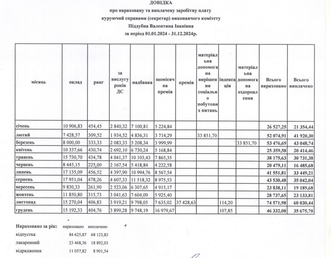 Загалом у 2024 році Валентині Піддубній нарахували 593 807 грн, виплатили 474 393 грн.