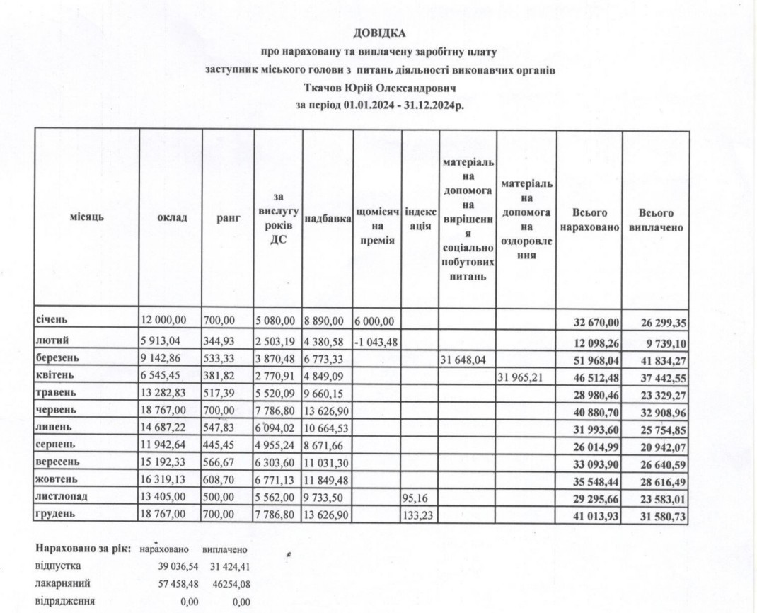 Загалом у 2024 році йому нарахували 506 565 грн, з них виплатили 406 349 грн.