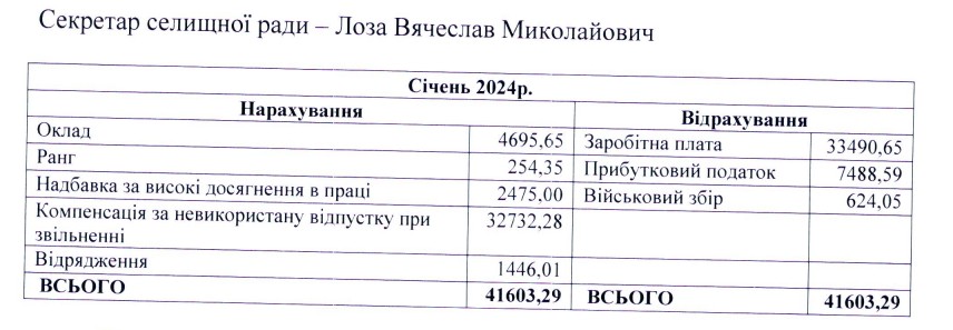 За січень йому нарахували оклад, надбавки за ранг і за високі досягнення в праці, а також кошти за відрядження. Найбільше коштів було за невикористану відпустку при звільненні – понад 32 тис. грн. Загалом за січень посадовцю нарахували 41 603 тис. грн, виплатили – 33 490 грн.