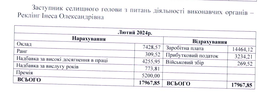 У відповіді на запит нам також надали дані щодо зарплати заступниці селищного голови Інеси Реклінг. Як і новий секретар ради, вона почала роботу у лютому 2024 року. Її оклад також спочатку був 12 000 гривень, і зріс з травня до 18 676 грн. Вона отримувала низку доплат: за ранг, за високі досягнення та за вислугу років.