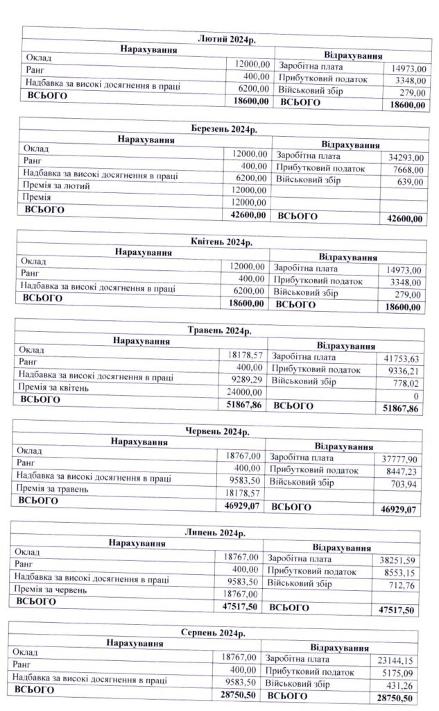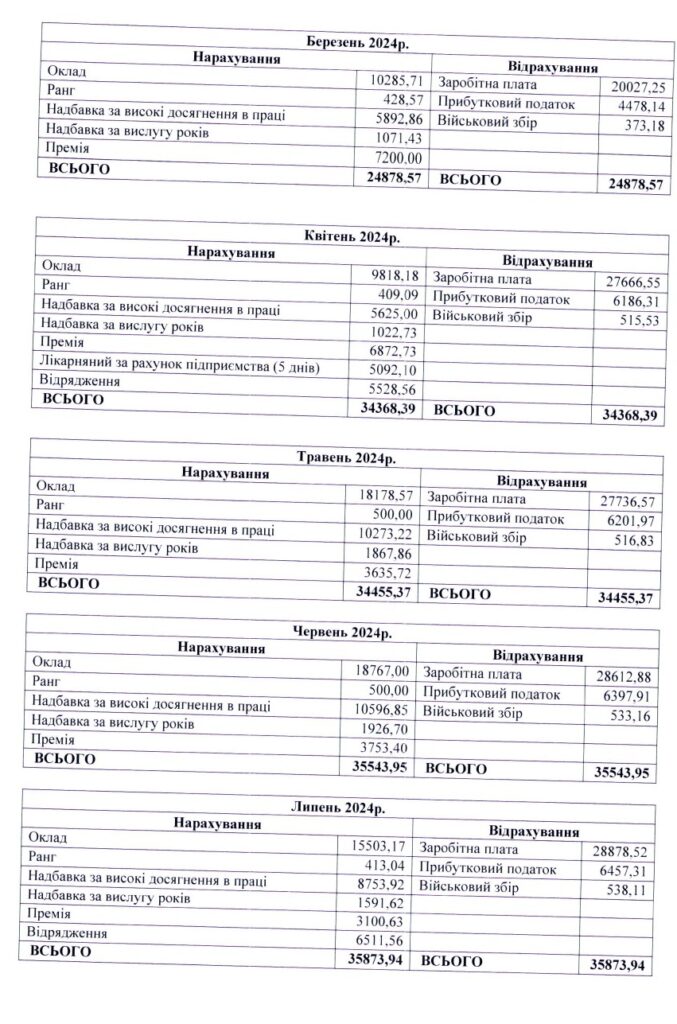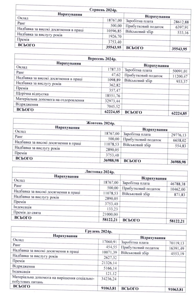 Найбільша зарплатня заступниці була у грудні за рахунок премії та матеріальної допомоги. Їй нарахували понад 91 тисячу гривень, після сплати податків вийшло приблизно 70 тисяч.