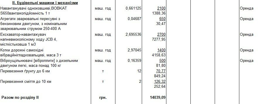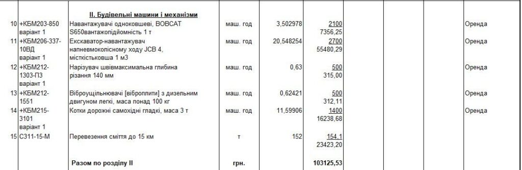 Згідно з поданою нею документацією для поточного ремонту двох тротуарів у Кременчуці, підприємниця планує орендувати технічні засоби, серед яких одноковшевий навантажувач BOBKAT S650, пересувні зварювальні агрегати з бензиновим двигуном, екскаватор-навантажувач JCB 4 з ковшем та дорожні самохідні вібраційні котки.