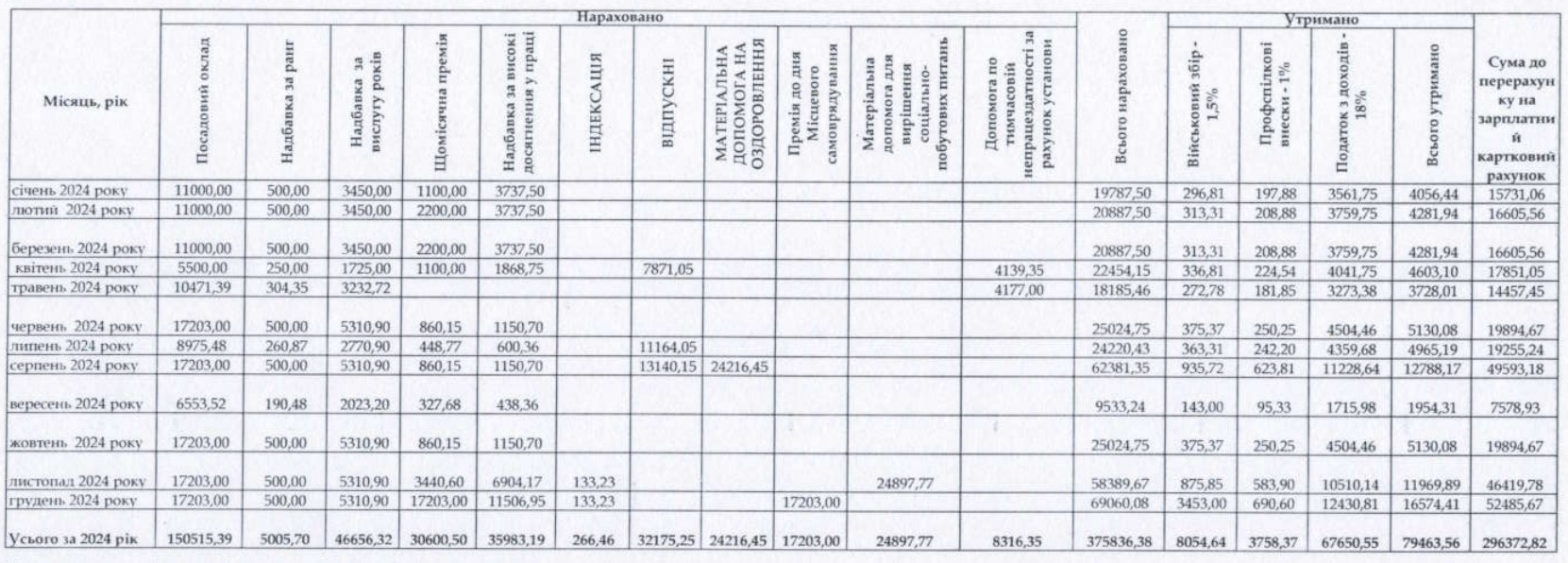 Усього у 2024 році Наталії Авраменко нарахували 375 836 грн зарплатні, з них, після сплати податків і відрахувань, вийшло 296 372 грн.