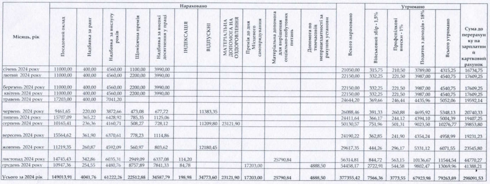 У 2024 році заступнику двічі виплатили матеріальну допомогу – у червні оздоровчі (24 655 грн) та у листопаді для вирішення соціально-побутових питань (27 606 грн).