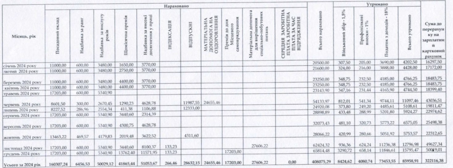 Усього у 2024 році, після сплати податків і зборів, заступник отримав 322 116 грн зарплатні. Загалом йому нарахували 408 075 грн.
