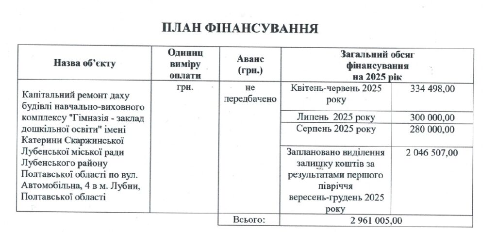 Договірна ціна є динамічною. Роботи оплачуватимуть за актами виконаних робіт. Аванс не передбачений. Згідно з планом фінансування: у квітні-червні виділять майже 335 тис. грн, у липні – 300 тис. грн, у серпні – 280 тис. грн. Ще понад 2 млн грн заплановані на вересень-грудень 2025 року.