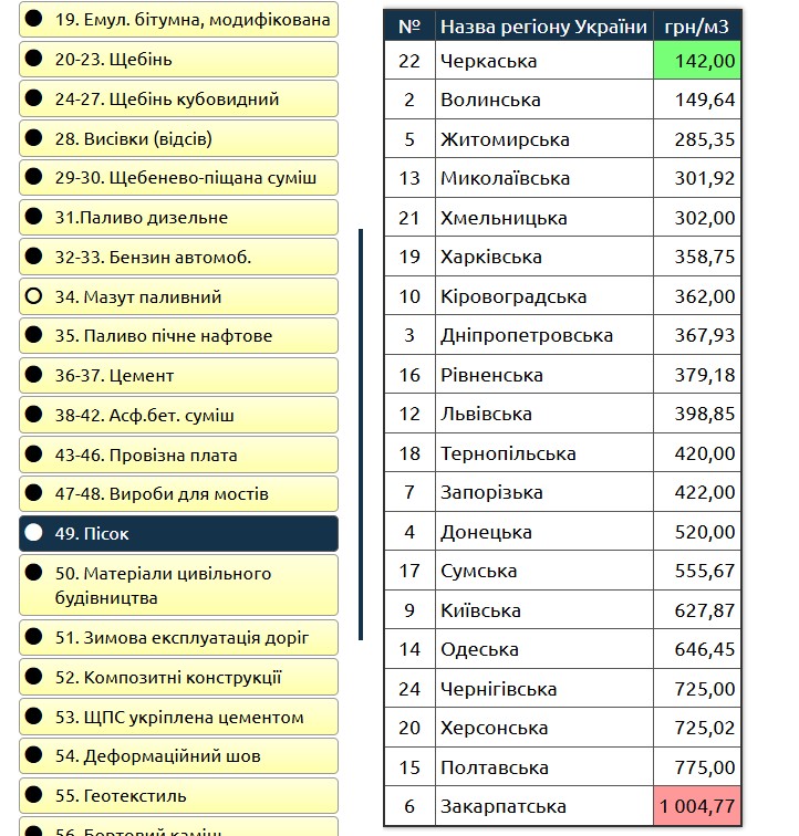 За даними ДП «НІРІ», середня ціна піску на Полтавщині – 775 грн/куб.м, що менше вдвічі (при тому, що ціна на пісок по регіону є однією з найвищих у країні).