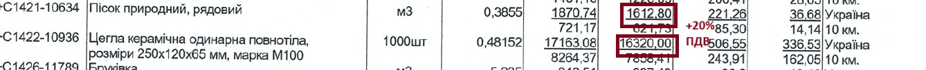 Цеглу керамічну одинарну повнотілу марки М100 (250х120х65 мм) у кошторисі прописали по 19 584 грн за тисячу штук, тоді як її ринкова вартість нижча відсотків на 50-60%: від 7 900 грн/1000 шт до 8 400 грн/1000 шт.