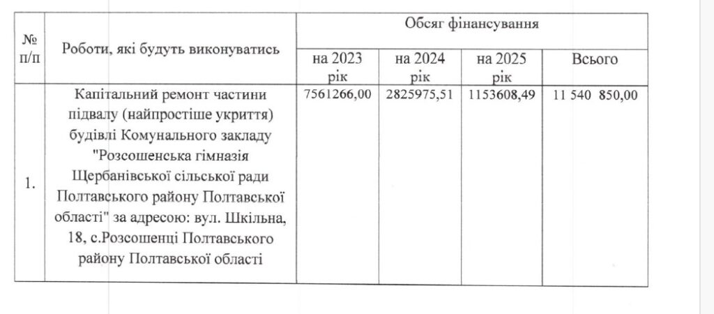 У ремонт шкільного укриття у Розсошенцях вкладуть ще 2 мільйони гривень