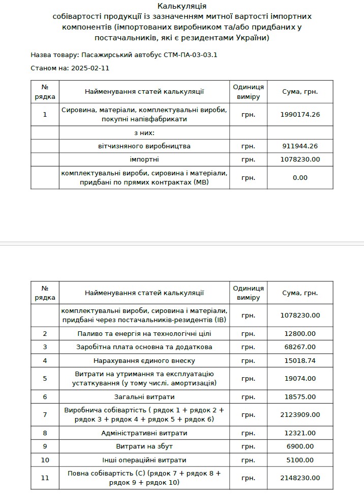 У лютому 2025 року ТОВ «Спец Техно Моторз» на платформі публічних закупівель Newtend, яка спеціалізується на продажу товарів і послуг через систему тендерів, вказувало, що собівартість автобуса СТМ-ПА-03-03.1 на базі Fiat Ducato становить 2 млн 148 тис. грн. Ступінь локалізації складала 47,6 %, а вартість імпортних компонентів становила близько 1 млн 78 тис. грн. Цьогоріч у березні компанія також вказувала на Newtend собівартість автобуса СТМ-ПА-03-03.1. Цього разу вона була меншою – 1 млн 935 тис. грн, а локалізація залишалась на рівні 47,6 %.
