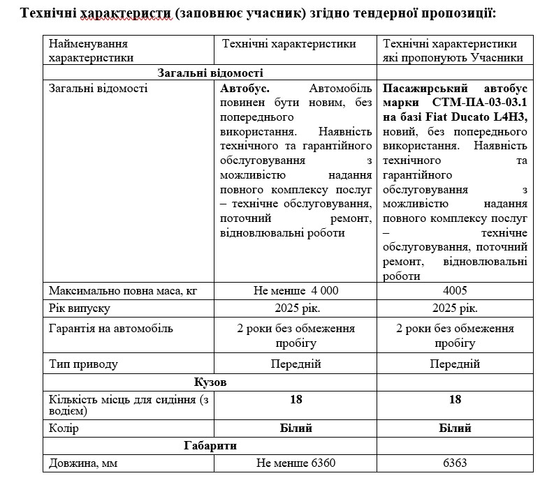 Цьогоріч до 25 травня компанія повинна доставити пасажирський автобус марки СТМ-ПА-03-03.1 на базі Fiat Ducato L4H3 на 18 пасажирів. Автобус 2025 року випуску має дизельний двигун Євро-6, системи безпеки, обігрівач, кондиціонер тощо.