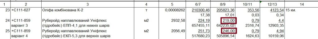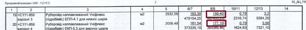 У відомості ресурсів, яку подавала ТОВ «ДЕР БАУ» на тендер, руберойд наплавлюваний Уніфлекс (гідробейс) ЕПП-4,1 і руберойд наплавлюваний Уніфлекс (гідробейс) ЕКП-5,3 для верхніх шарів враховано по ціні 159,4 і 177,19 грн/кв.м (ціна без ПДВ).