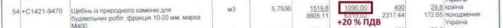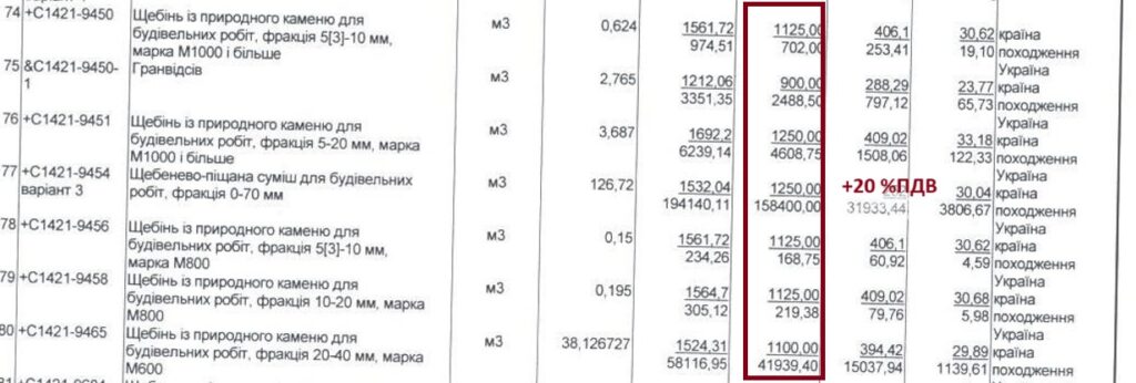 Щебінь фракція 10-20 мм, марка М600 у кошторисі – 1 350 грн/куб.м, ДП «Нірі» – 468,33 грн/куб.м. Щебінь фракція 20-40 мм, марка М600 у кошторисі – 1 320 грн/куб.м, ДП «Нірі» – 331,98 грн/куб.м.