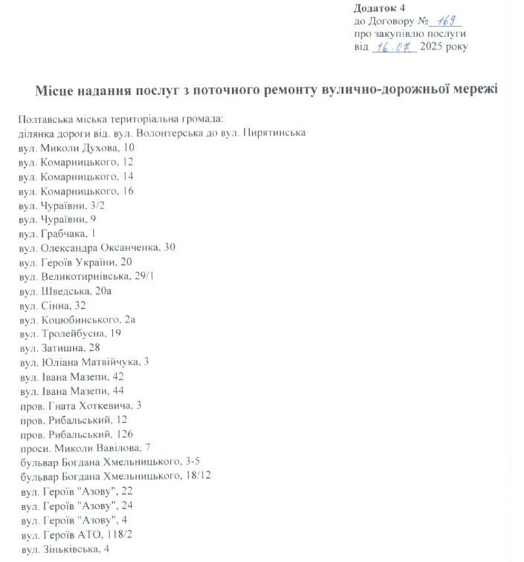 Згідно з додатком до договору, роботи планують провести на бульварі Богдана Хмельницького, вул. Лесі Українки, вул. Вʼячеслава Липинського, вул. Панаса Мирного, площі Слави тощо. Загалом у переліку близько 50 вулиць і адрес.
