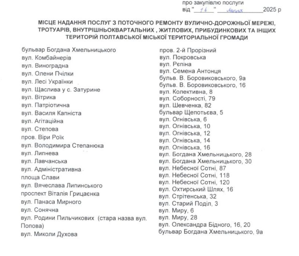 Управління житлово-комунального господарства виконавчого комітету Полтавської міської ради 16 липня 2025 року уклало два контракти на поточний ремонт дорожньої інфраструктури. Йдеться про ремонти вулично-дорожньої мережі, тротуарів, прибудинкових та внутрішньоквартальних територій в Полтаві. Загальна вартість обох закупівель – 38,6 млн грн. Про це стало відомо з системи Prozorro.