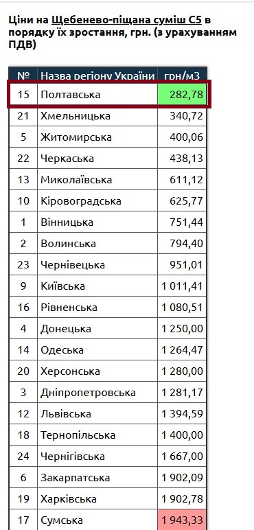 Щебінь з природнього каменю фракція 5[3]-10 і марка М1000 і більше по 1 350 грн/куб.м, середня ціна на щебінь такої марки по Полтавській області 508,26 грн/куб.м, тобто менша на 60 %.