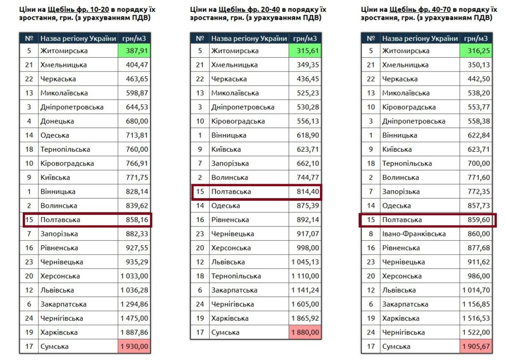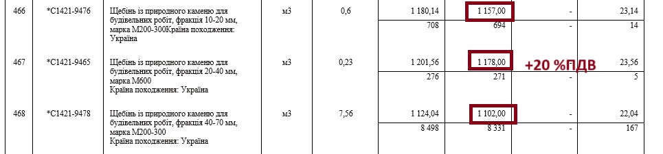 Щебінь із природного каменю для будівельних робіт, фракція 10-20 мм, марка М200-300 по 1 473,4 грн/м3, ТОВ «ДРСУ Полтава» – 1 388,4 грн/м3. За даними червневого моніторингу цін державного підприємства «НІРІ», середня ціна на щебінь такої марки по Полтавській області 858,16/м3. Щебінь для будівельних робіт, фракція 20-40 мм, марка М600 у кошторисі по 1 413,6, за даними ДП «НІРІ» – 814,4 грн/м3. Щебінь із природного каменю для будівельних робіт, фракція 40-70 мм, марка М200-300 у кошторисі – 1 322,4 грн/м3, за даними ДП «НІРІ» – 859,6 грн/м3.