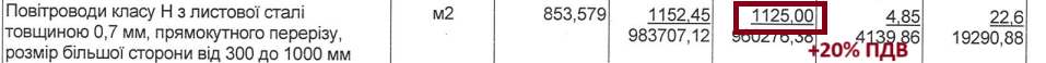 Повітроводи класу Н з оцинкованої сталі товщиною 0,7 мм прямокутного перерізу враховані по 1 992 грн/кв. м.