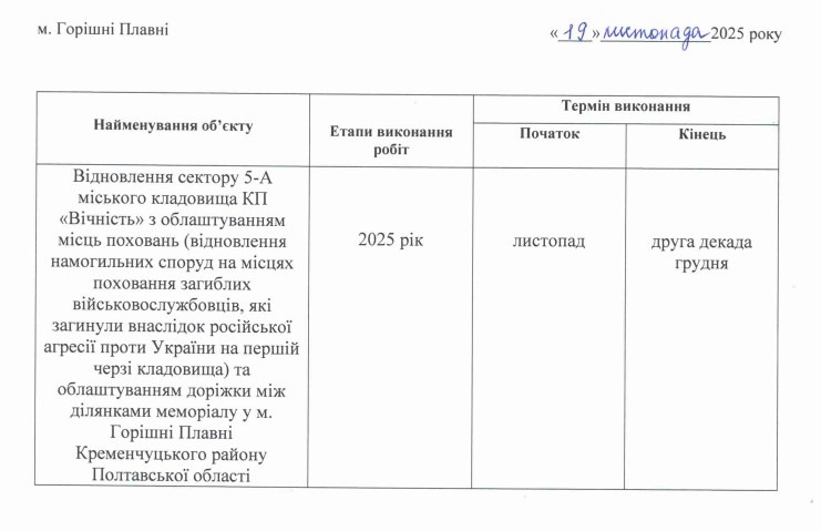 Як йдеться в угоді, підрядник повинен підготувати ділянку, облаштувати доріжки та фундаменти, укласти бетон і гранітні плити, встановити бортові камені та пам’ятники, провести засипку і перевезення ґрунту, а також забезпечити герметизацію щілин.