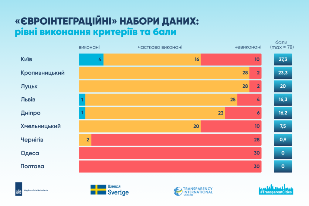 Аналітики перевірили 11 муніципалітетів і оцінили їх за 40 індикаторами. Максимально місто могло набрати 100 балів. Середній рівень виконання індикаторів у вибірці становить 23,1%.