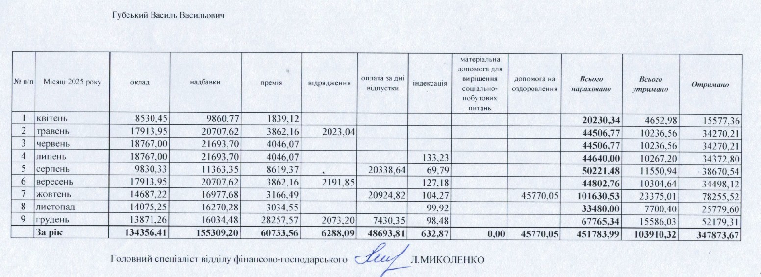 Загалом за 2025 рік Василю Губському виплатили близько 347,8 тис. грн заробітної плати на руки.