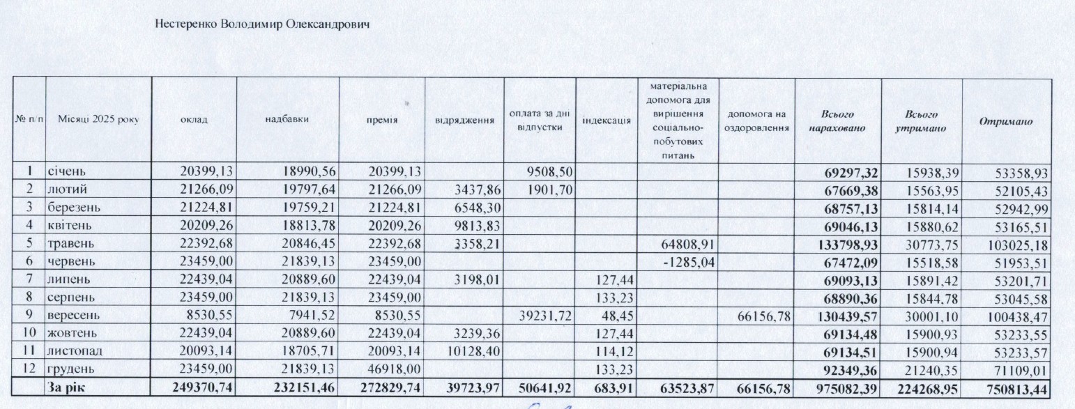 Загалом за 2025 рік міському голові нарахували 975 тис. грн, виплатили близько 751 тис. грн.