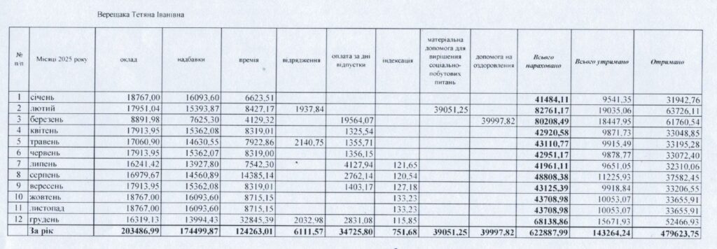 Її посадовий оклад протягом 2025 року становив 18 767 грн. Крім окладу, нараховувалися надбавки та премії, розмір яких коливався залежно від місяця (від 5,5 до 33,9 тис. грн).